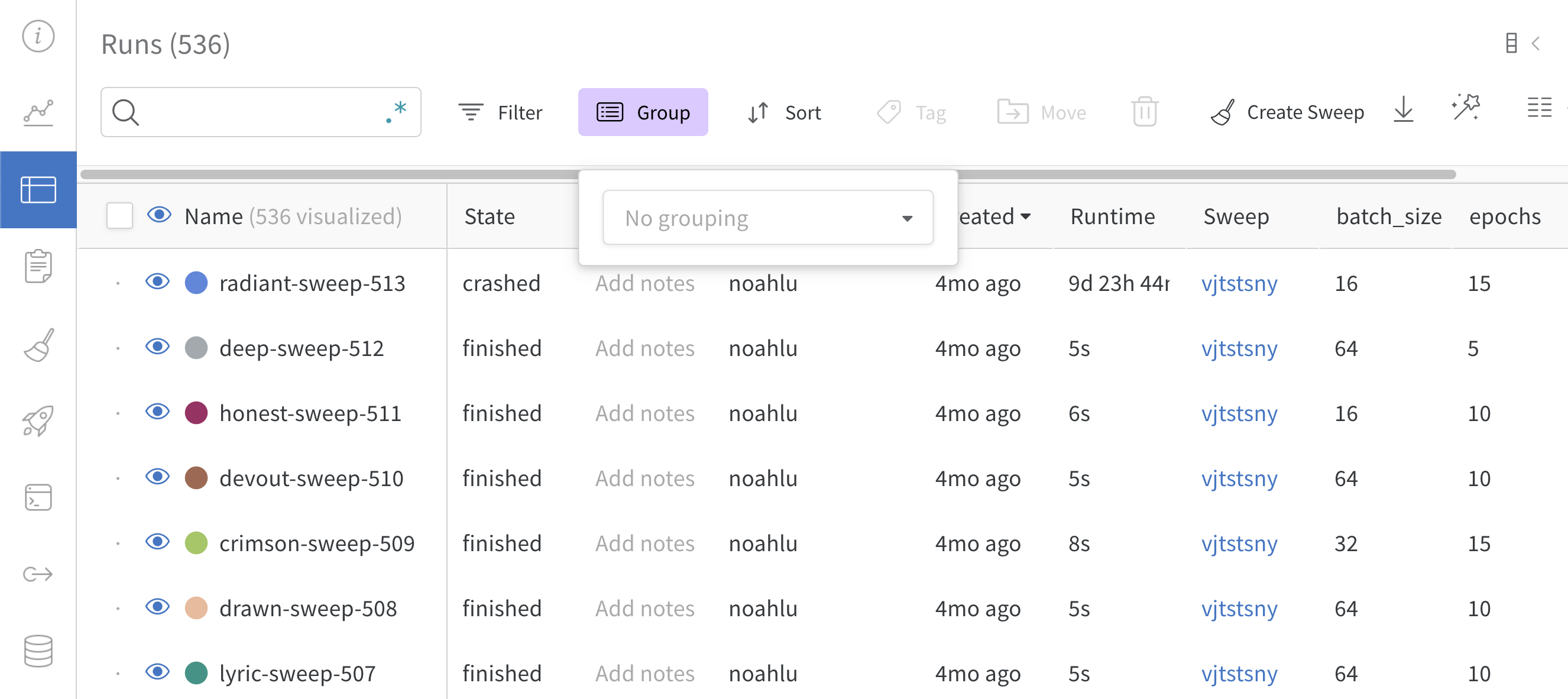 W&B 앱을 사용하여 W&B 테이블을 정렬, 필터링 및 그룹화하세요.